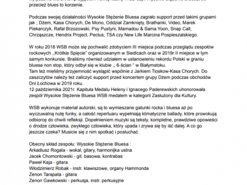Korzystając z okazji pragniemy serdecznie podziękować Przewodniczącemu Kapituły Medalu Heleny i Ignacego Paderewskich Burmistrzowi Robertowi Gołaszewskiemu i Wszystkim, którzy przyczynili się, aby nasz zespół Wysokie Stężenie Bluesa WSB dołączył do tak zacnego grona uhonorowanych.