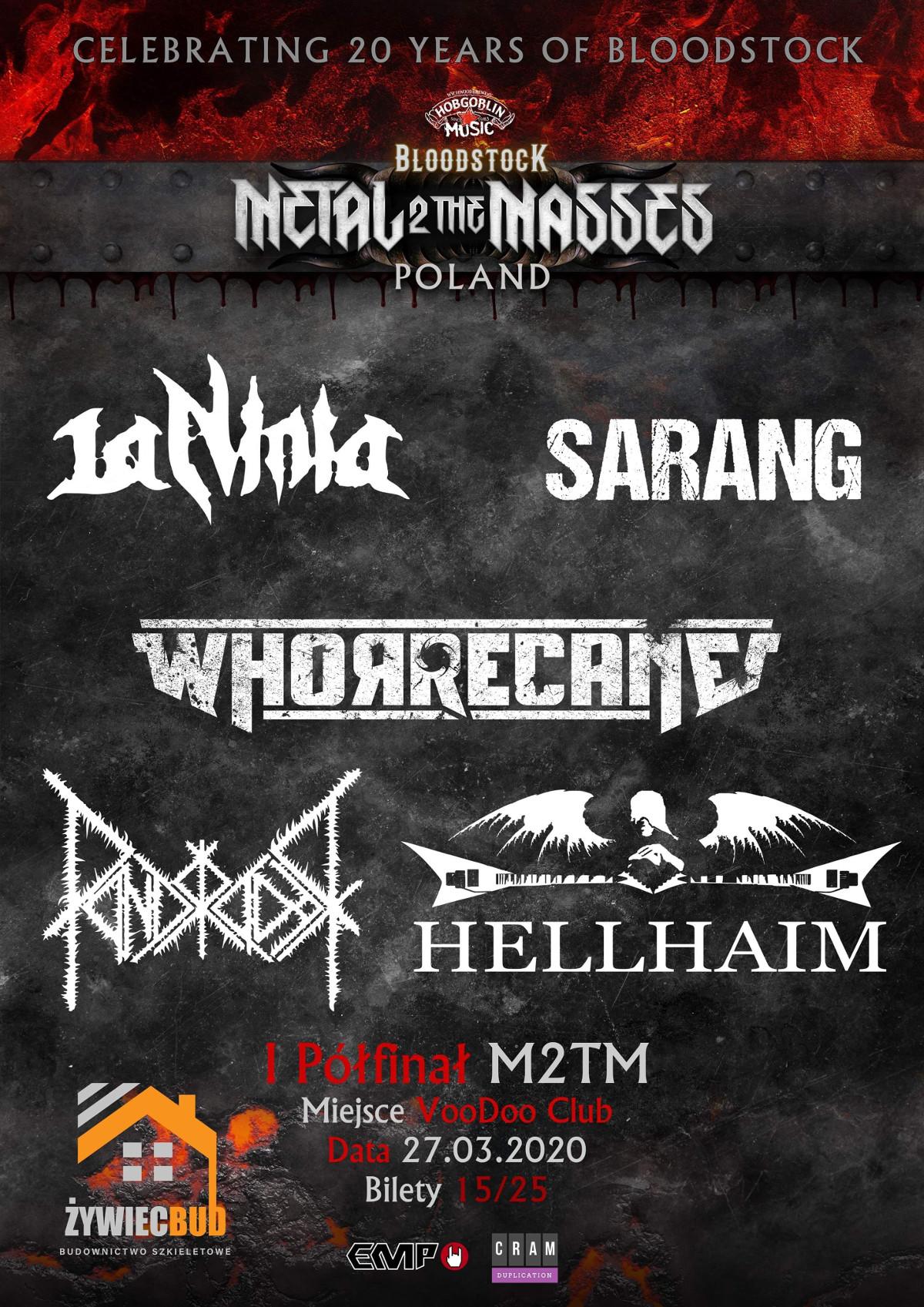 27.03.2020r w Warszawie w Klubie Voodoo będziemy mogli zaobserwować na żywo pierwszy półfinał Bloodstock Metal 2 The Messes Poland. W pierwszym półfinale zmierzą się: LaNinia, Sarang, Pandrador, Hellhaim, Whorrecane. Spośród wymienionych zespołów, drogą eliminacji, zostanie wyłoniony jeden, który tym samym uzyska szansę walki w finale o możliwość zaprezentowania swoich umiejętności scenicznych znacznie szerszej publiczności na festiwalu Bloodstock w UK. Zdecydowanie jest o co walczyć, zatem każda z grup z pewnością da z siebie wszystko. Choć ostateczny werdykt należeć będzie do jury, to ogromny wpływ na wynik mają również fani i zgromadzona na koncertach publika.