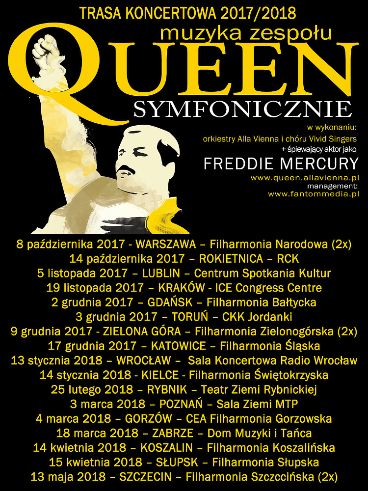 Już za miesiąc, 8 października dwoma wyprzedanymi koncertami w Filharmonii Narodowej, projekt Queen Symfonicznie rozpocznie trasę koncertową. Do wiosny muzycy zaprezentują się ponad 25 razy w całej Polsce. W Warszawie, Zabrzu i Krakowie klasyczny skład będzie poszerzony o Hollyłódzką Orkiestrę Filmową. Oto pełna lista już potwierdzonych terminów: